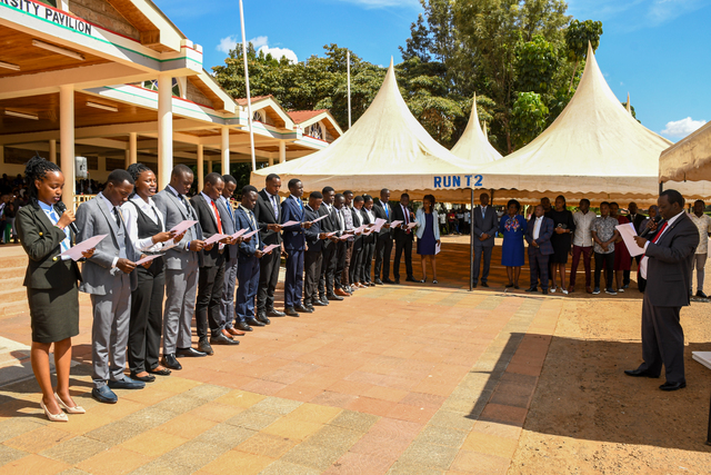 The newly elected 2025/2026 CUSA leaders were officially sworn in today in a ceremony overseen by Vice-Chancellor Prof. Henry Mutembei. The event marked a smooth and peaceful transition of leadership, reinforcing the university’s commitment to democratic governance and student representation. Ben Geoffrey “Jakatoo” was sworn in as the new CUSA chairperson, leading a team dedicated to serving students with equity, inclusivity, and dedication. The newly elected leaders pledged to advocate for student welfare and work collaboratively with the administration to enhance the university experience. The handover ceremony was attended by university officials, outgoing student leaders, and students. Prof. Mutembei commended both the incoming and outgoing teams for their commitment to student leadership and urged the new leaders to uphold integrity, accountability, and inclusivity in their service. With this transition, the 2025/2026 CUSA leadership embarks on its mission to foster a more inclusive and dynamic student government, ensuring that every student’s voice is heard and represented effectively.
