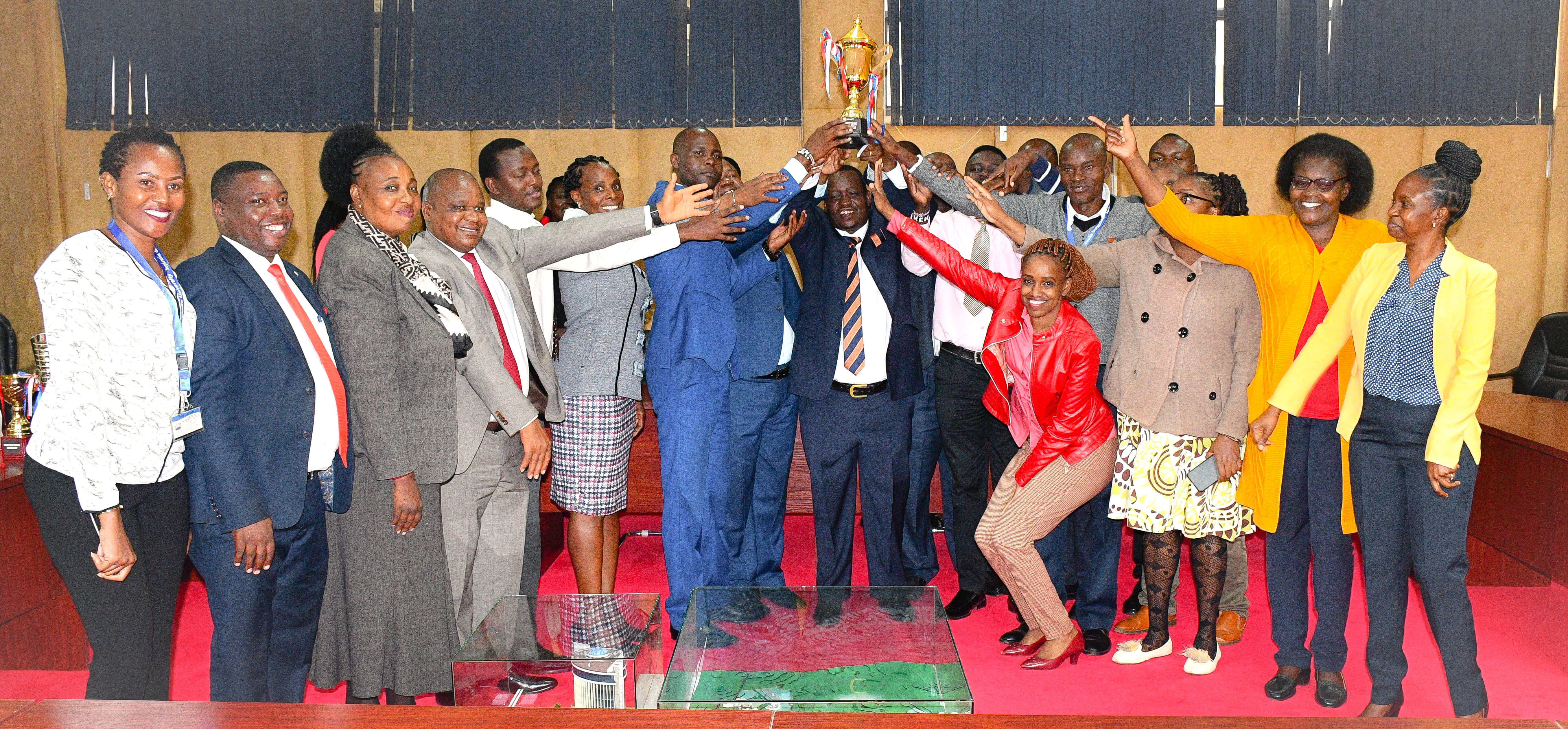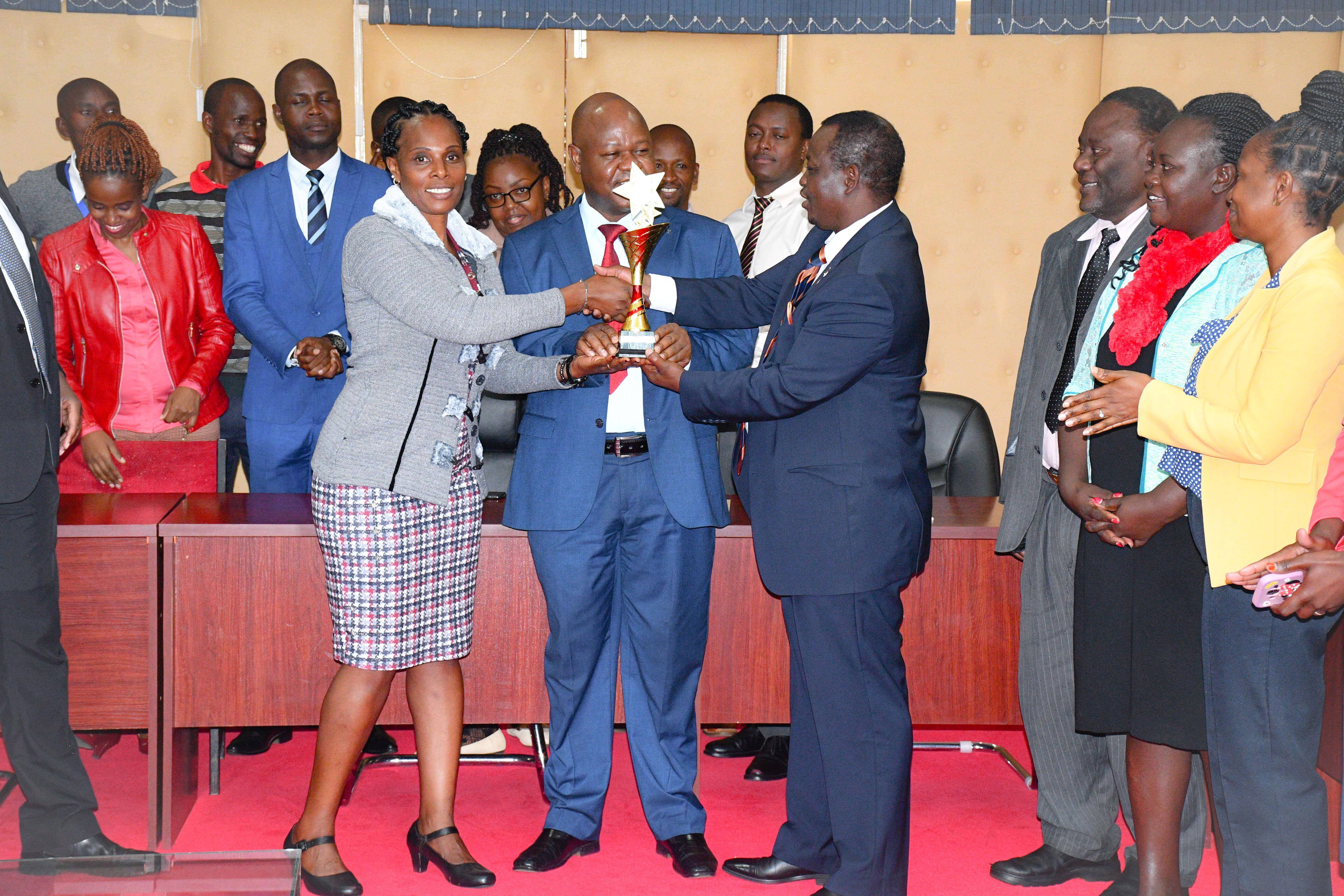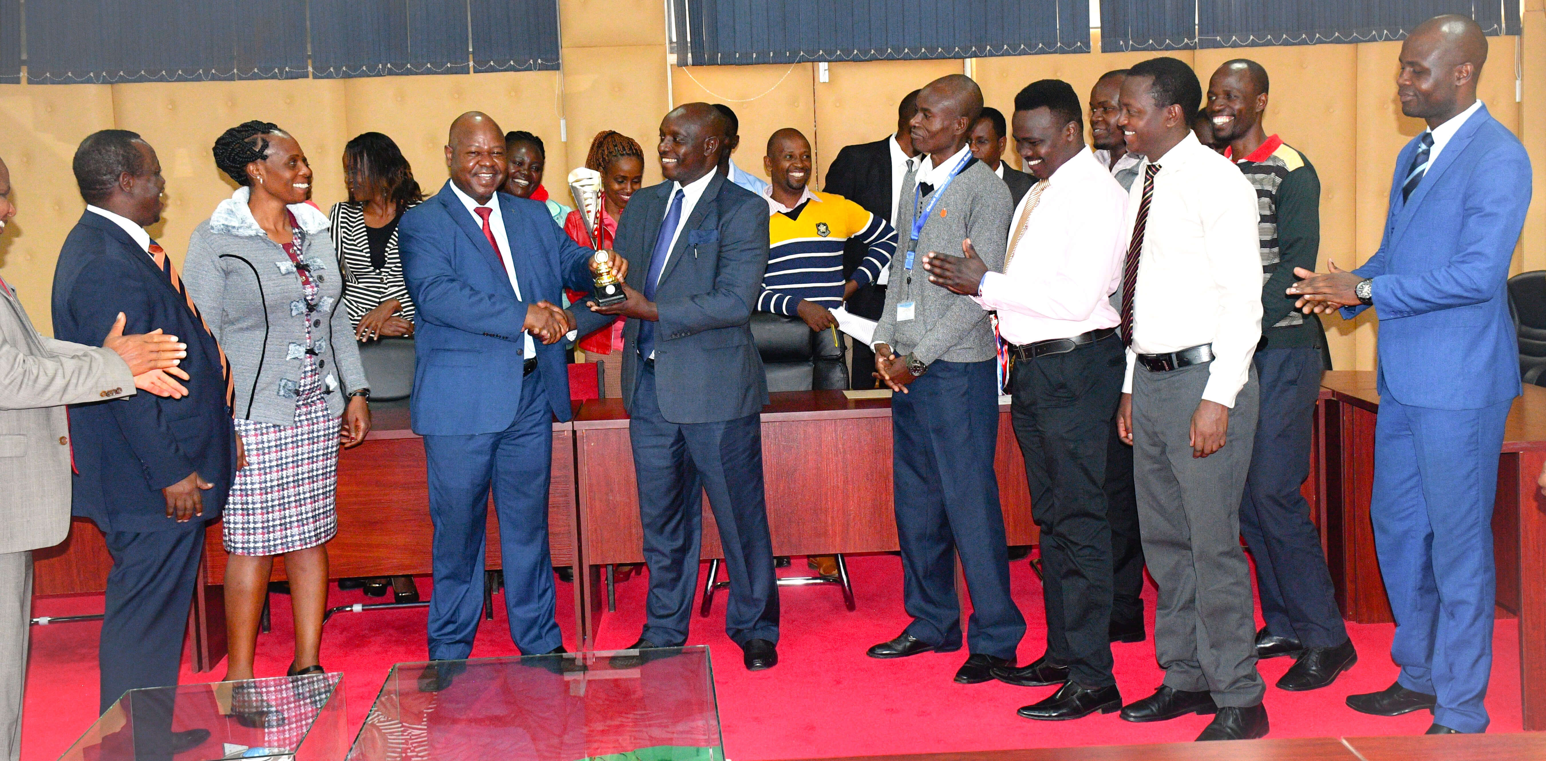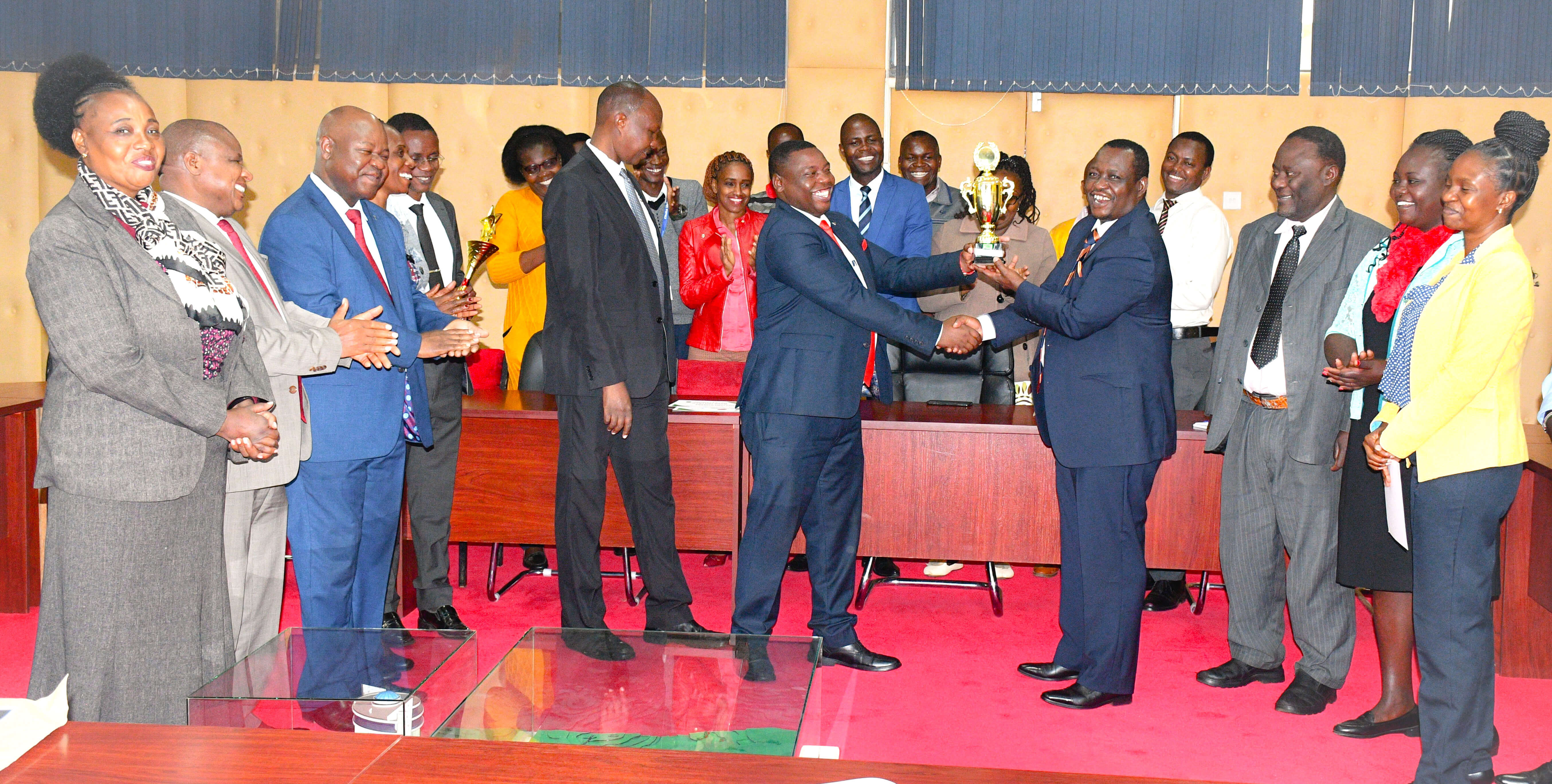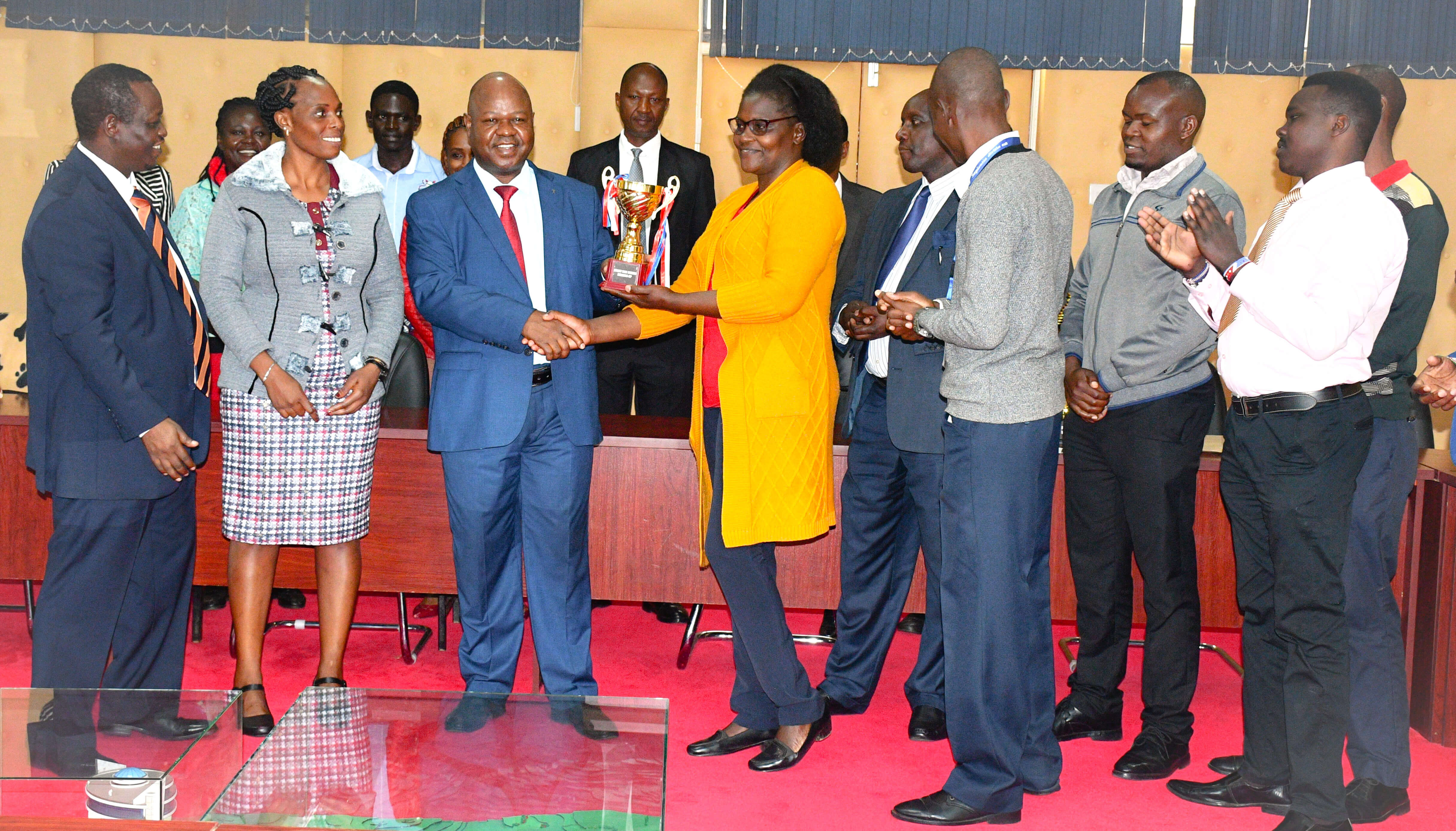 Vice Chancellor Prof. Henry Mutembei receives trophies, celebrating achievements in sports and agricultural innovation.