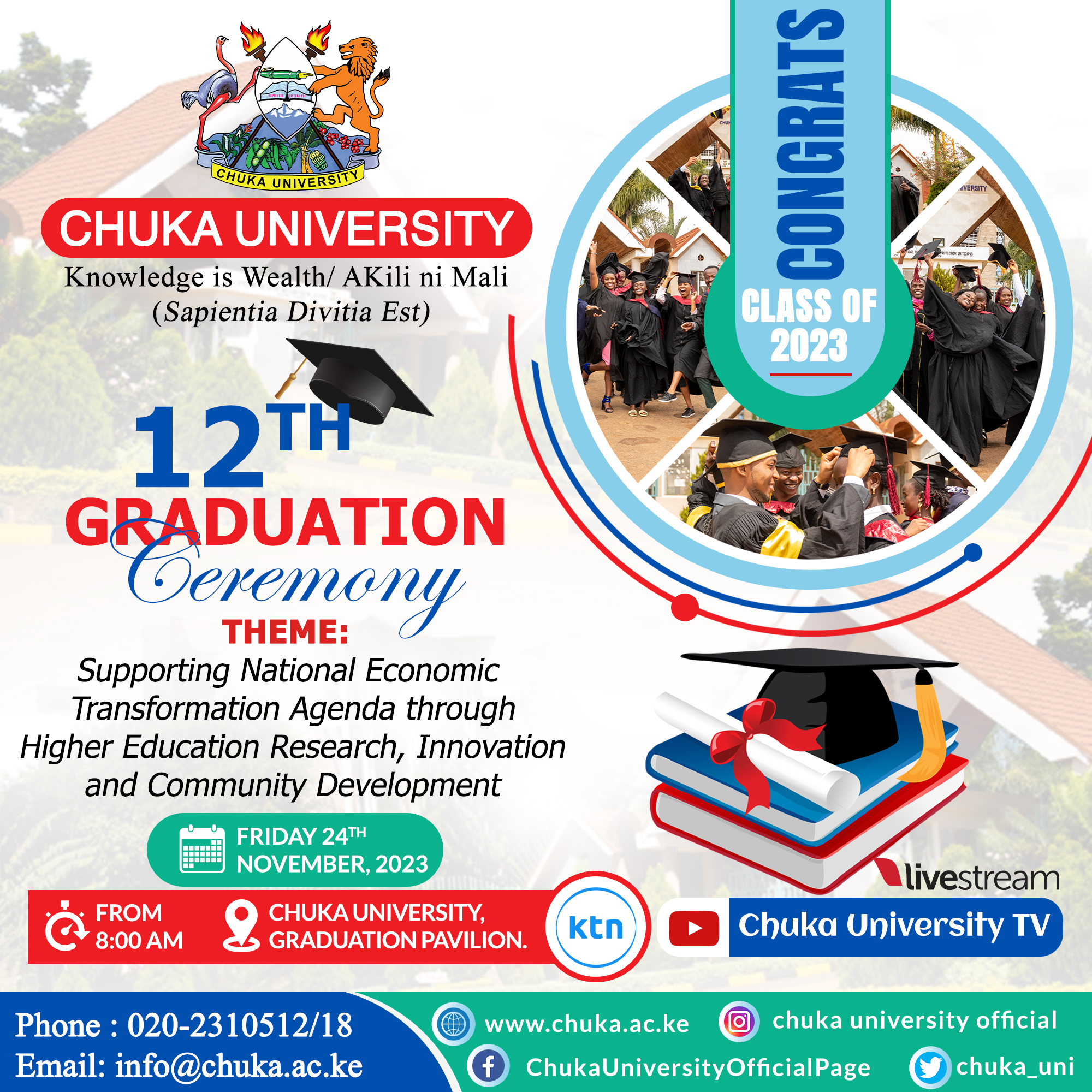 Welcome to our 12th graduation ceremony to take place on November 24, 2023, at Chuka University Graduation Pavilion. The theme for this year’s graduation ceremony will be “Supporting National Economic Transformation Agenda through Higher Education Research Innovation and Community Development.” We eagerly anticipate witnessing you and your colleagues celebrate this momentous occasion that comes once. We take pride in our graduates