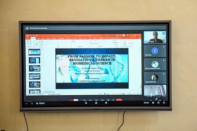 The insightful session featured distinguished guest speakers who provided valuable guidance on diverse career opportunities and emerging trends in the fields of biochemistry and biomedical sciences. Dr. Winnie Okeyo delivered an engaging presentation on the application of biochemistry in food science, animal health, and biotechnology. She also highlighted the role of insects as a potential food source and explored various career pathways available in these dynamic fields.
