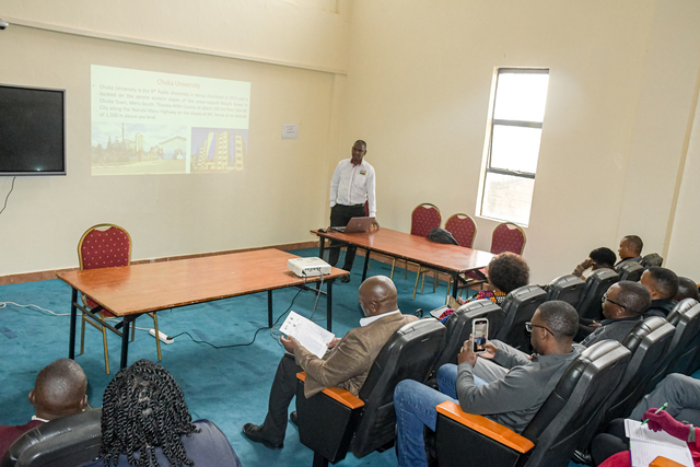 During the morning opening session, participants were introduced to Chuka University’s involvement in the 1890 Centers of Excellence for Global Food Security and Defence (CEGFSD). Presentations provided an overview of Kenya’s agricultural sector, highlighting national priorities, policy landscapes, and technological advancements. Experts shared insights on Kenya’s best practices in climate-smart agriculture, value chain development, and farmer-led innovation, while also drawing connections with global agricultural approaches.