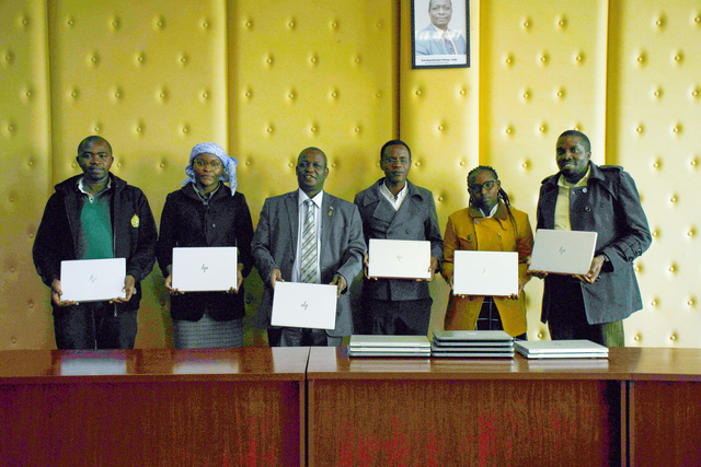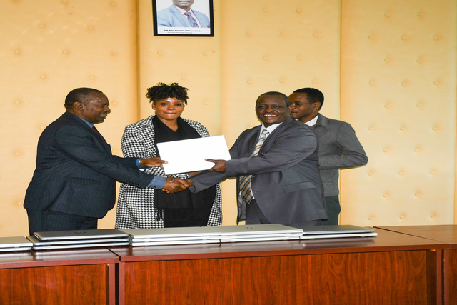 The Vice-Chancellor Prof. Henry Mutembei hands over the laptops to the DVC AFP&D Prof. Jonah Kindiki. Looking on Ms. Ann Makau, Ag. Procurement Officer and Mr. Charles Kinyua Head of ICT