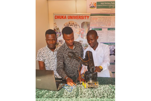 Mr. Ezra Masinde demonstrates how their robotic arm functions