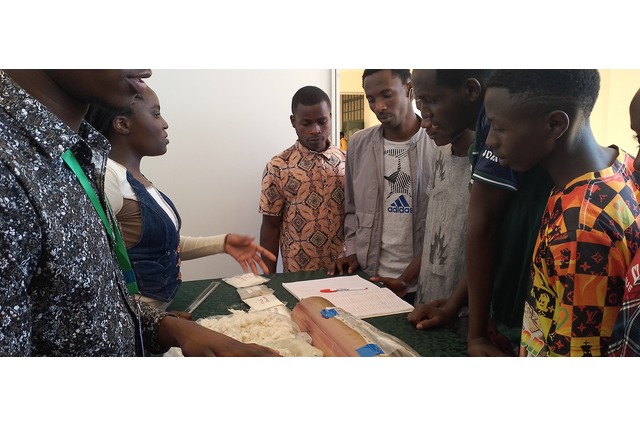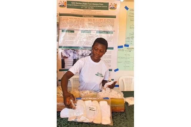 Miss Pamela Apuko demonstrating the use of her sanitary pads made from banana fibre