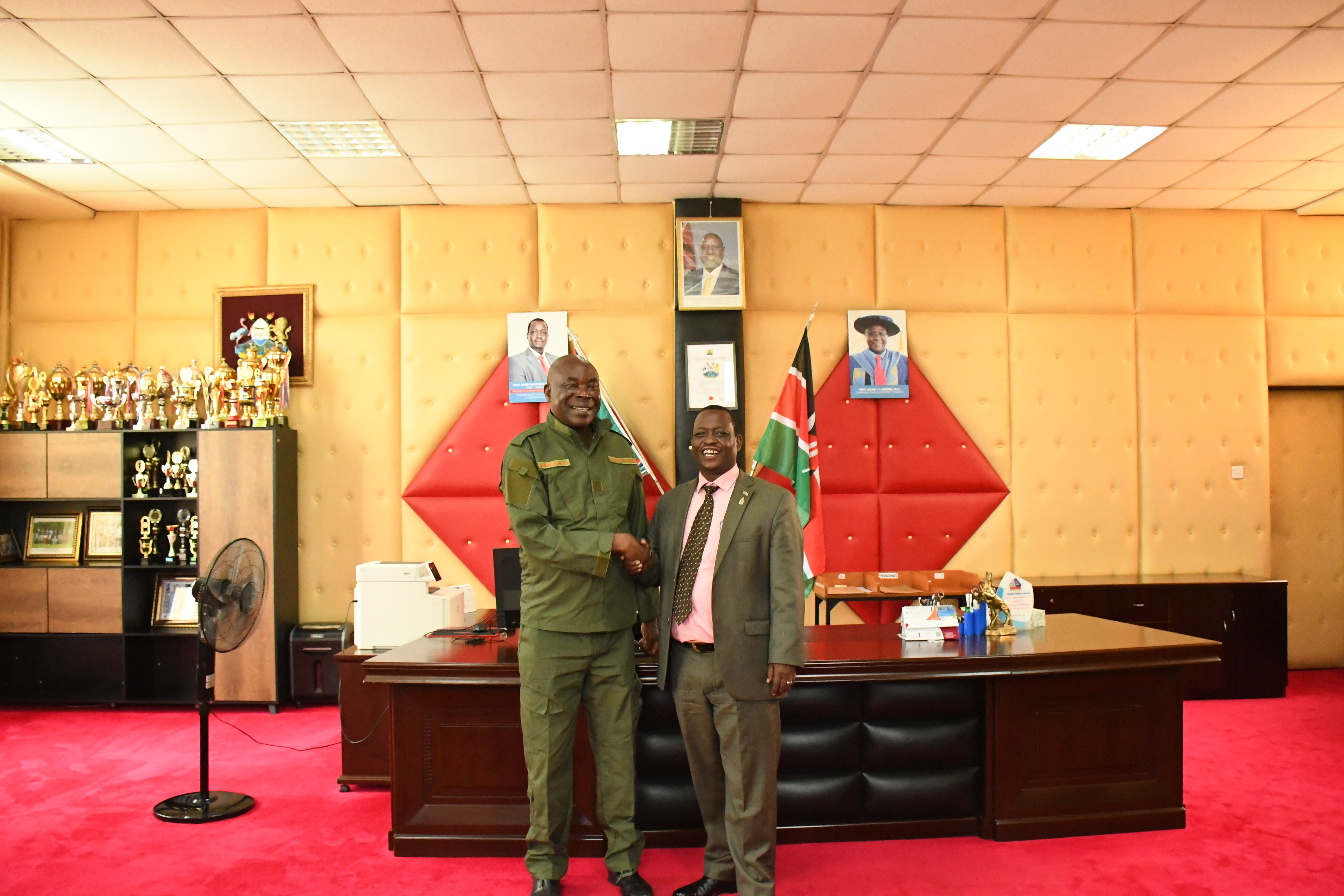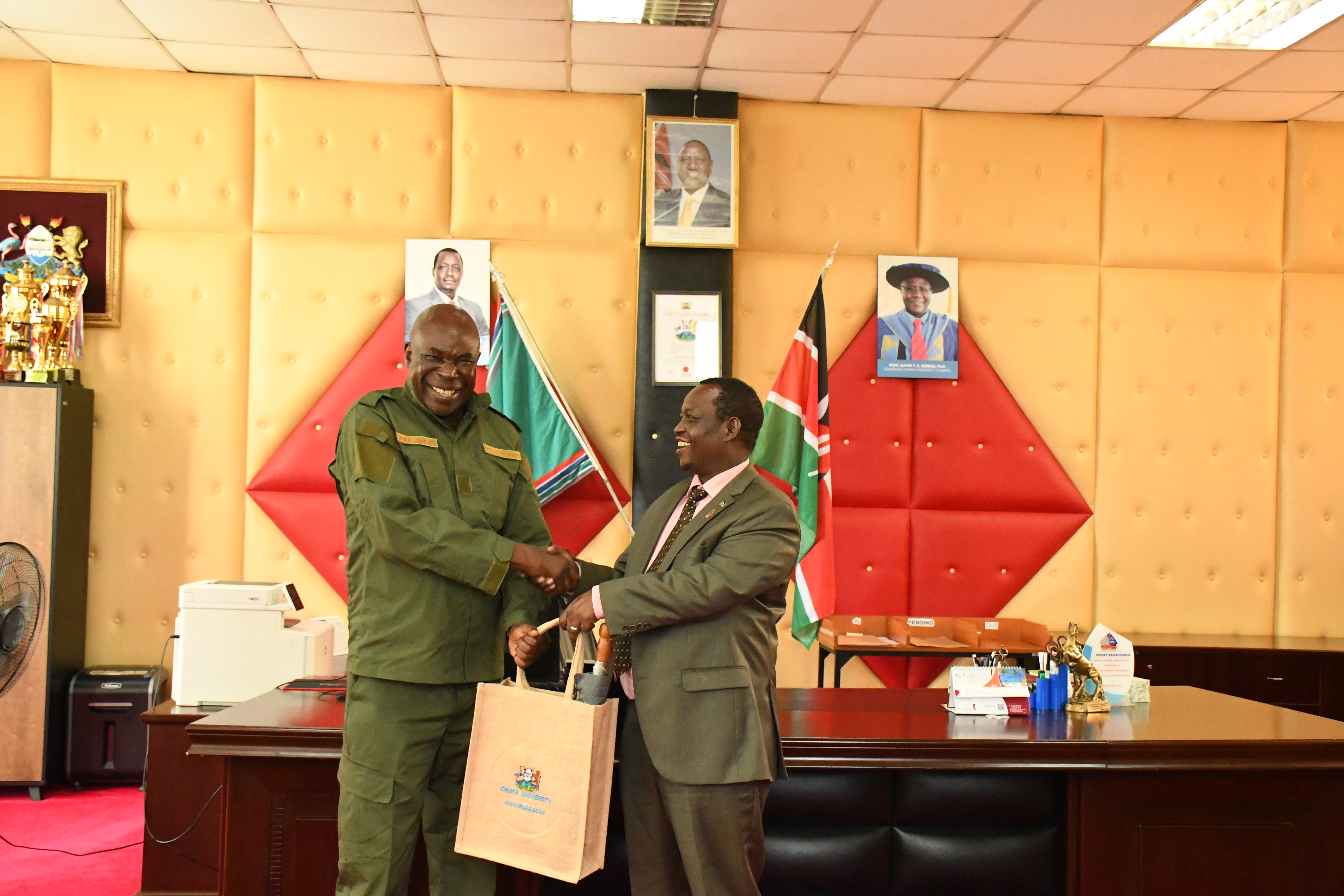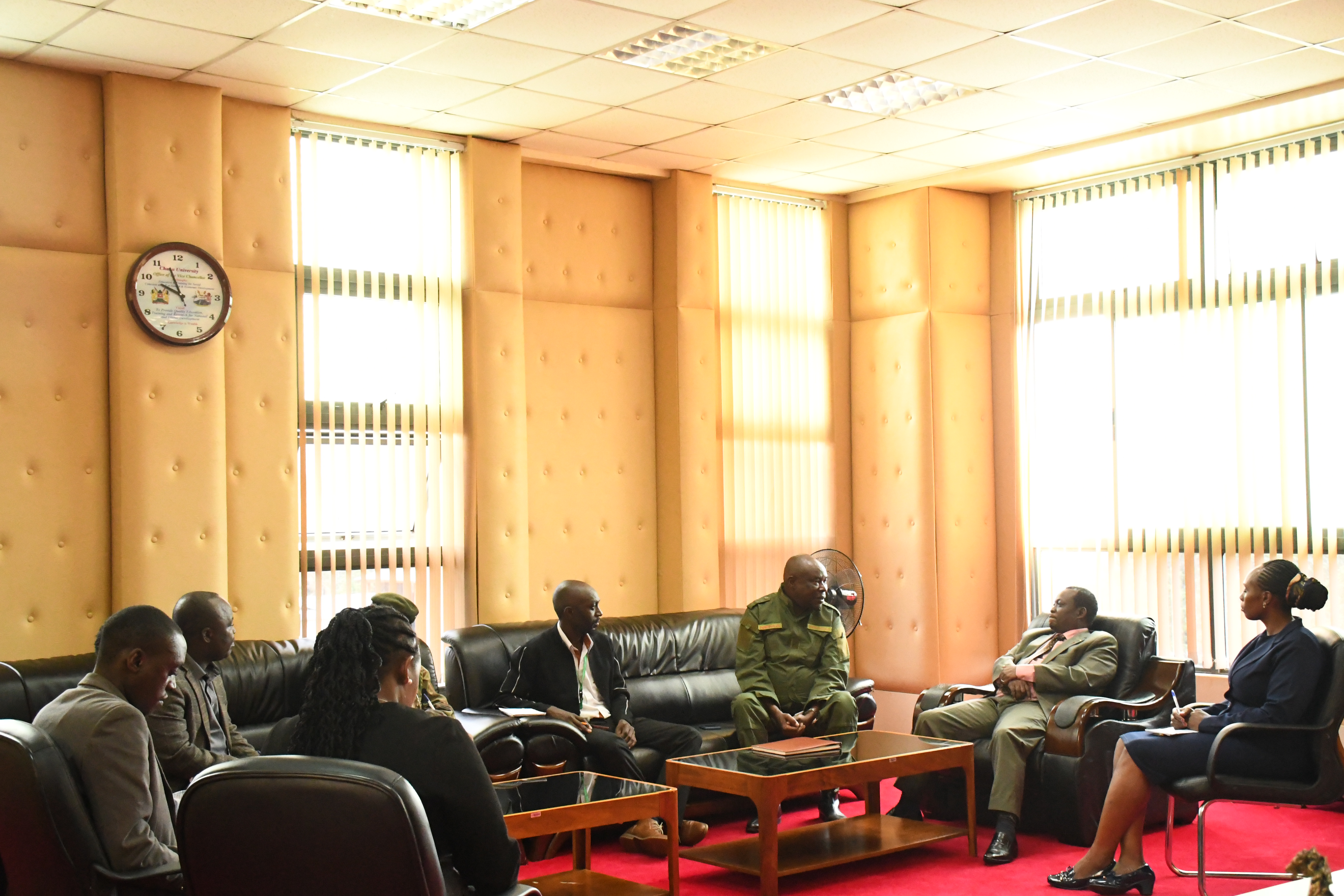 Today, Prof. Charles Ngome, a board member from the National Environmental Management Authority (NEMA) alongside a three-member delegation, paid a courtesy visit to Vice-Chancellor Prof. Henry Mutembei. The primary objective of the visit was to discuss the University’s role in national environmental conservation efforts. During the meeting, Professor Ngome commended Chuka University for its proactive stance in planting over one million trees across various public sites including schools, hospitals, forests, riparian lands, and wetlands.