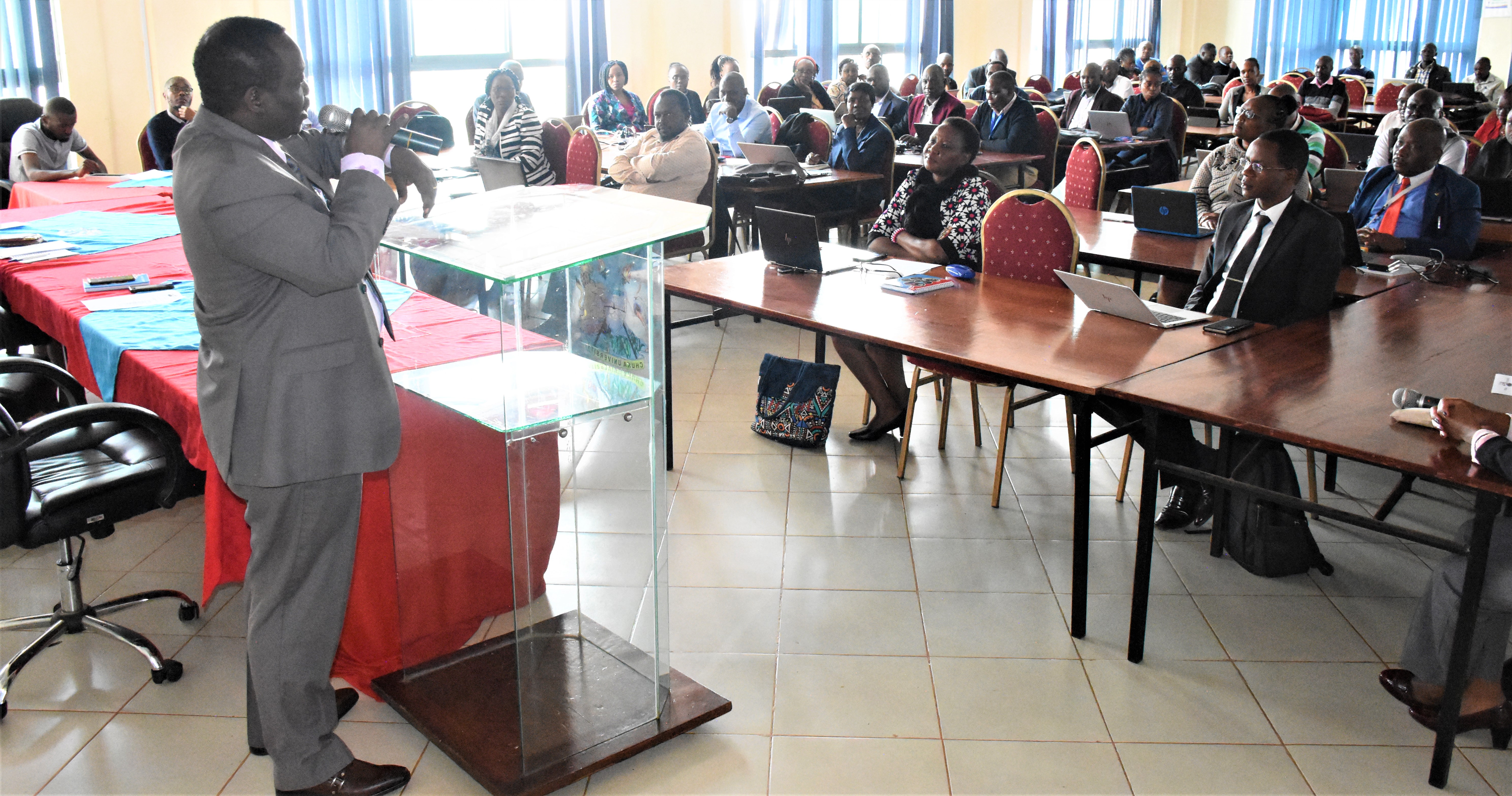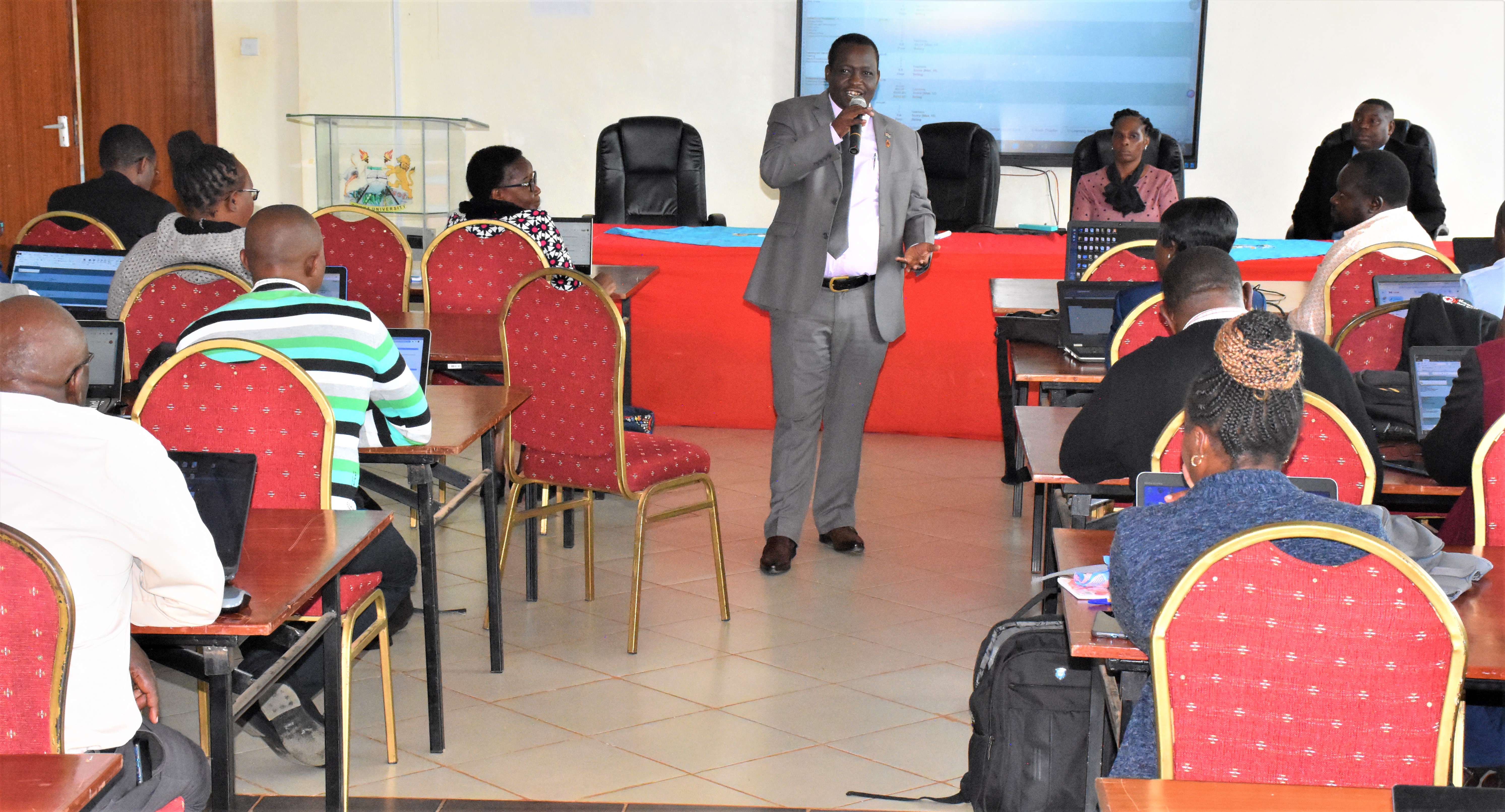 Vice Chancellor Professor Henry Mutembei gives his speech highlighting the benefits of the peer review tool in enhancing evaluation and collaboration for academic staff at the peer review tool sensitization seminar." Thank you