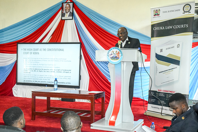 Chuka University School of Law students engaged in a thought-provoking Human Rights Lecture led by Hon. Justice Edward Muriithi, Presiding Judge of the Meru High Court, on November 26, 2024. Themed “Upholding Human Rights in a Changing Kenya,” the lecture was part of the Pre-Summit Human Rights Lecture Circuit, an initiative by the High Court to promote dialogue on critical human rights issues nationwide. Hon. Muriithi, accompanied by a delegation of judicial officers, including Hon. Tracy Wachira, highlighted the pivotal role of legal education in fostering human rights awareness and advocacy. He commended the students for their active participation, encouraging them to champion human rights in their legal careers.