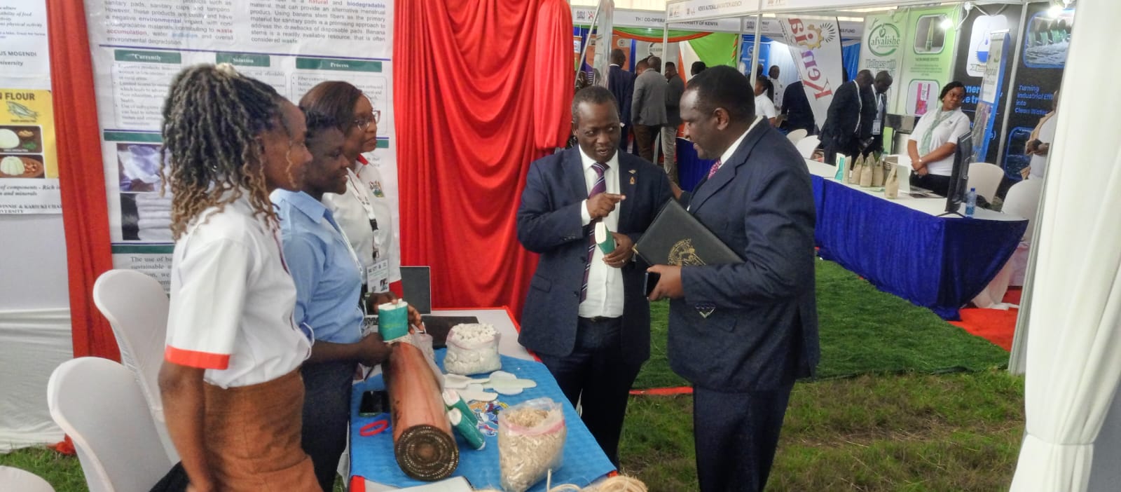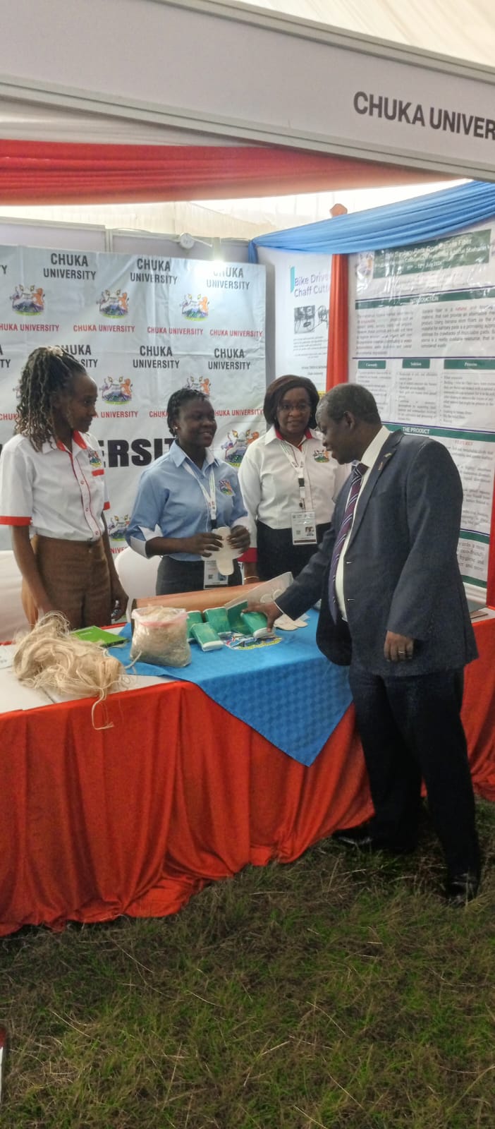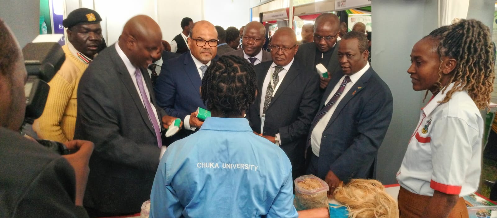 Prof. Henry Mutembei and other stakeholders visit the Chuka University stand as Ms. Pamela Apuko explains her innovation.